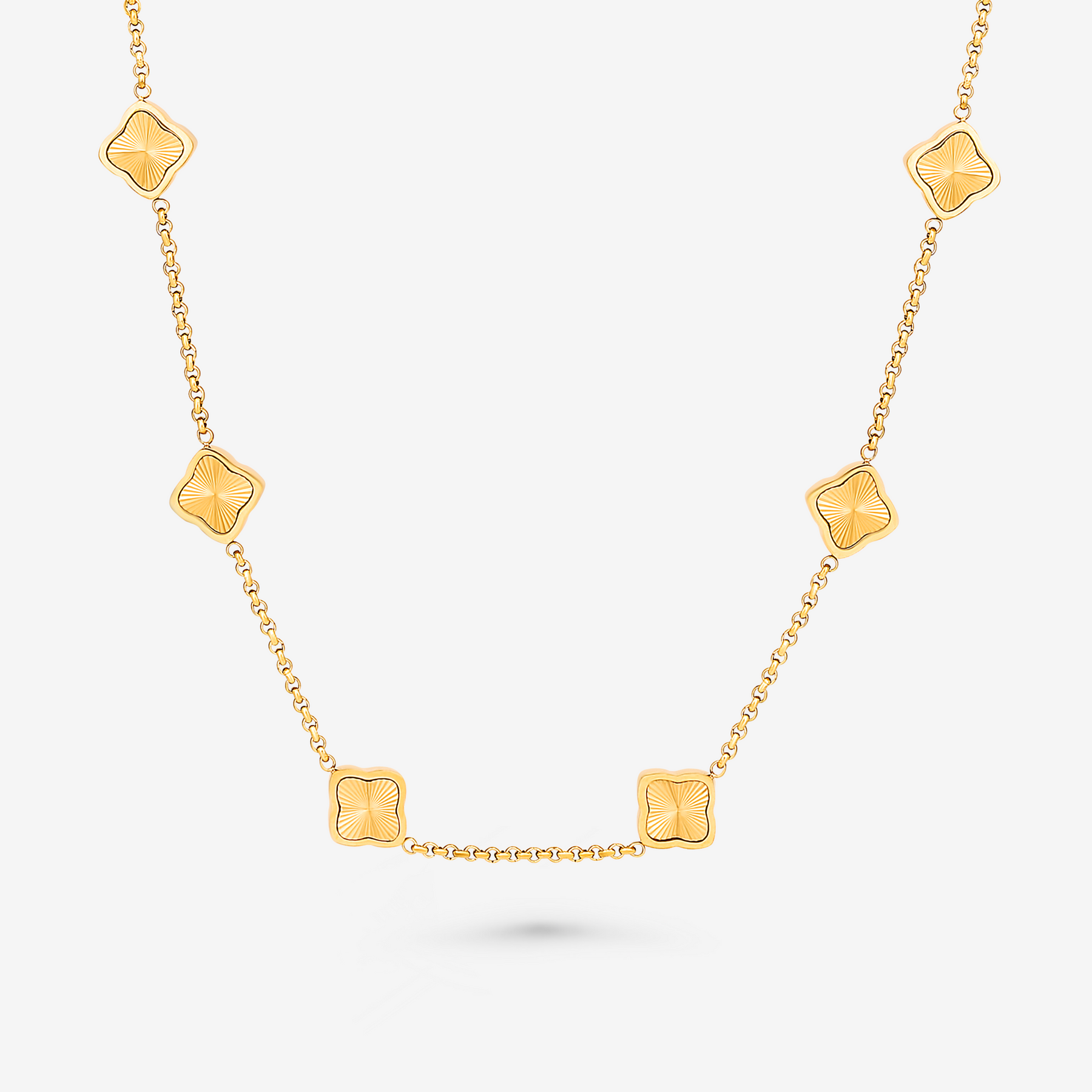 The CLOVER Ten Necklace exudes luxury and elegance with its refined clover pendants that gracefully drape around your neck. This necklace is a timeless statement piece that enhances any outfit, from casual to chic.