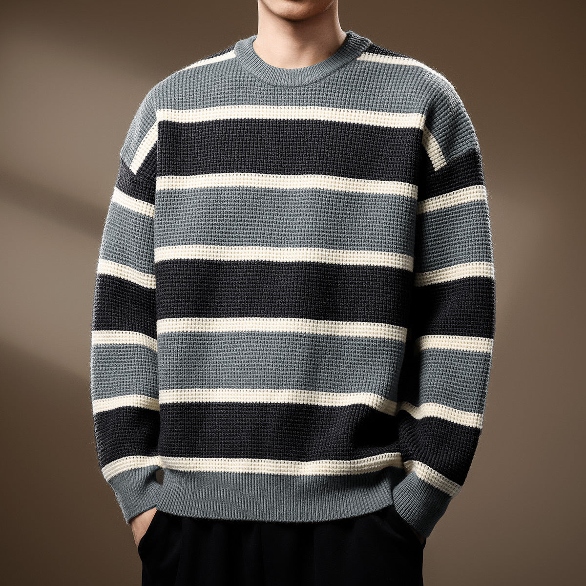 Enjoy easy-going elegance with this Waffle-Knit Sweater, featuring a textured knit and bold horizontal stripes that bring a modern twist to a timeless design. Crafted from a soft, breathable cotton blend, it offers the perfect balance of comfort and style. The relaxed fit makes it ideal for layering or wearing on its own — a versatile essential that feels as good as it looks.